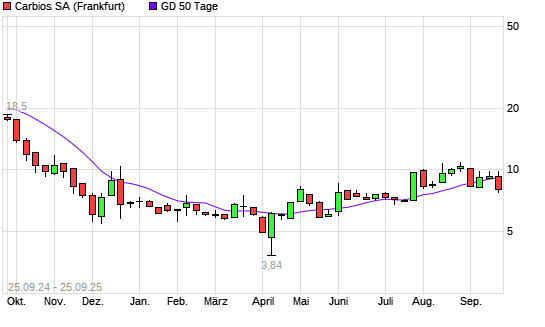 Mit dem Rücksetzer auf 8,73 EUR hat die Carbios-Aktie am 24.09.2025 die 50-Tage-Linie nach unten gekreuzt.
