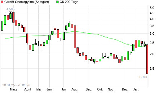 Mit dem Rücksetzer auf 1,63 EUR hat die Cardiff Oncology-Aktie am 27.01.2026 die 200-Tage-Linie nach unten gekreuzt.