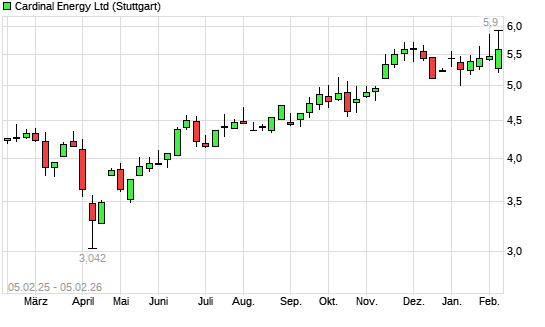 Mit dem Anstieg auf 5,81 EUR hat die Cardinal Energy-Aktie (ISIN CA14150G4007) am 04.02.2026 ein neues 3-Jahres-Hoch erreicht und damit den Kurs vom 28.01.2026 eingestellt.