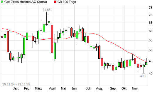 Mit dem Rücksetzer auf 44,74 EUR hat die Carl Zeiss Meditec-Aktie am 28.11.2025 die 100-Tage-Linie nach unten gekreuzt.