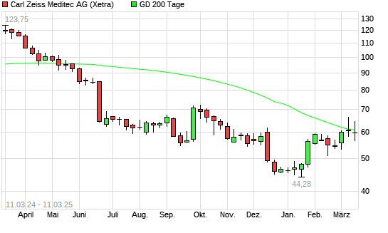 Mit dem Rücksetzer auf 57,65 EUR hat die Carl Zeiss Meditec-Aktie am 10.03.2025 die 200-Tage-Linie nach unten gekreuzt.