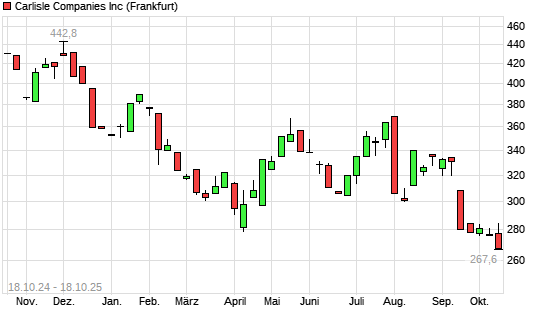 Mit dem Rücksetzer auf 267,60 EUR hat die Carlisle Cos-Aktie (ISIN US1423391002) am 17.10.2025 ein neues 12-Monats-Tief erreicht und damit den Kurs vom 01.10.2025 eingestellt.