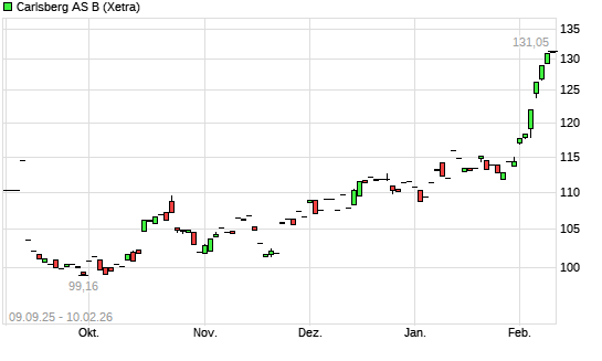 Mit dem Anstieg auf 128,65 EUR hat die Carlsberg B-Aktie (ISIN DK0010181759) am 09.02.2026 ein neues 12-Monats-Hoch erreicht und damit den Kurs vom 05.06.2025 eingestellt.