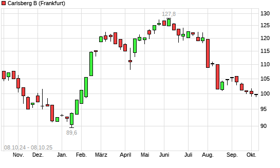 Mit dem Rücksetzer auf 99,06 EUR hat die Carlsberg B-Aktie (ISIN DK0010181759) am 07.10.2025 ein neues 6-Monats-Tief erreicht und damit den Kurs vom 06.10.2025 eingestellt.