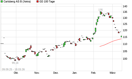 Mit dem Rücksetzer auf 114,45 EUR hat die Carlsberg B-Aktie am 17.03.2026 die 100-Tage-Linie nach unten gekreuzt.