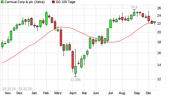 Mit dem Anstieg auf 22,52 EUR hat die Carnival-Aktie am 14.10.2025 die 100-Tage-Linie nach oben gekreuzt.
