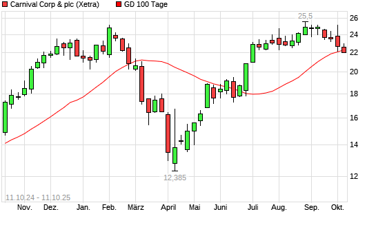 Mit dem Rücksetzer auf 21,82 EUR hat die Carnival-Aktie am 10.10.2025 die 100-Tage-Linie nach unten gekreuzt.