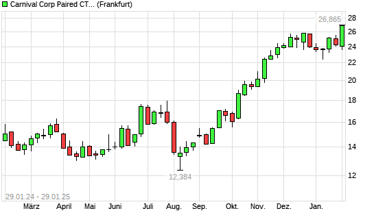 Mit dem Anstieg auf 26,51 EUR hat die Carnival Corporation-Aktie (ISIN PA1436583006) am 28.01.2025 ein neues 3-Jahres-Hoch erreicht und damit den Kurs vom 20.12.2024 eingestellt.