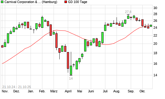 Mit dem Anstieg auf 24,79 EUR hat die Carnival Corporation-Aktie am 20.10.2025 die 100-Tage-Linie nach oben gekreuzt.