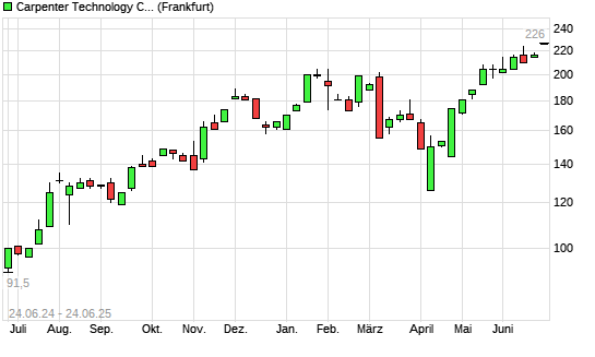 Mit dem Anstieg auf 226,00 EUR hat die Carpenter Technology-Aktie (ISIN US1442851036) am 23.06.2025 ein neues All-Time-High erreicht und damit den Kurs vom 10.06.2025 eingestellt.