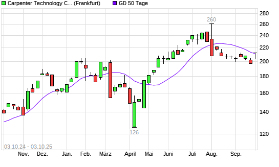 Mit dem Anstieg auf 212,00 EUR hat die Carpenter Technology-Aktie am 02.10.2025 die 50-Tage-Linie nach oben gekreuzt.