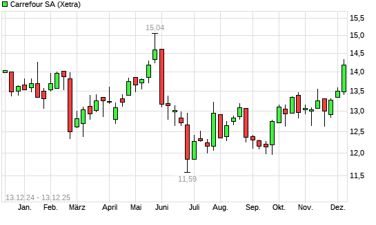 Mit dem Anstieg auf 14,15 EUR hat die Carrefour-Aktie (ISIN FR0000120172) am 12.12.2025 ein neues 6-Monats-Hoch erreicht und damit den Kurs vom 11.12.2025 eingestellt.