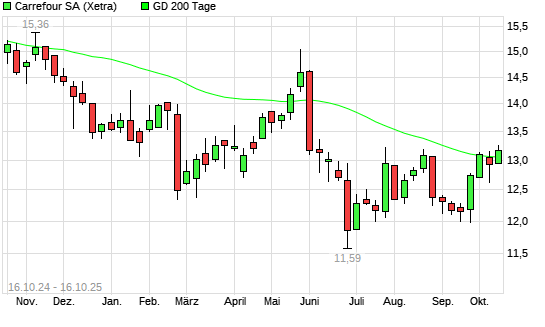 Mit dem Anstieg auf 13,12 EUR hat die Carrefour-Aktie am 15.10.2025 die 200-Tage-Linie nach oben gekreuzt.