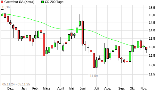 Mit dem Rücksetzer auf 12,70 EUR hat die Carrefour-Aktie am 04.11.2025 die 200-Tage-Linie nach unten gekreuzt.