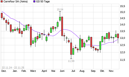 Mit dem Rücksetzer auf 12,82 EUR hat die Carrefour-Aktie am 21.11.2025 die 50-Tage-Linie nach unten gekreuzt.