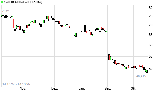 Mit dem Rücksetzer auf 49,56 EUR hat die Carrier Global-Aktie (ISIN US14448C1045) am 13.10.2025 ein neues 12-Monats-Tief erreicht und damit den Kurs vom 25.09.2025 eingestellt.