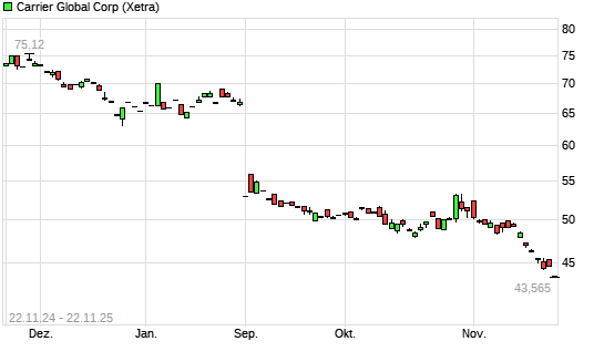 Mit dem Rücksetzer auf 43,64 EUR hat die Carrier Global-Aktie (ISIN US14448C1045) am 21.11.2025 ein neues 12-Monats-Tief erreicht und damit den Kurs vom 20.11.2025 eingestellt.