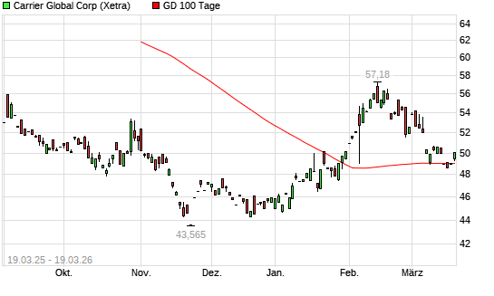 Mit dem Anstieg auf 50,30 EUR hat die Carrier Global-Aktie am 18.03.2026 die 100-Tage-Linie nach oben gekreuzt.