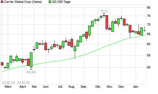 Mit dem Anstieg auf 65,60 EUR hat die Carrier Global-Aktie am 11.02.2025 die 200-Tage-Linie nach oben gekreuzt.