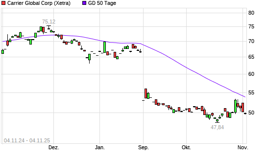 Mit dem Anstieg auf 52,07 EUR hat die Carrier Global-Aktie am 03.11.2025 die 50-Tage-Linie nach oben gekreuzt.