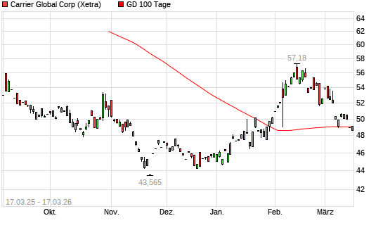 Mit dem Rücksetzer auf 48,54 EUR hat die Carrier Global-Aktie am 16.03.2026 die 100-Tage-Linie nach unten gekreuzt.