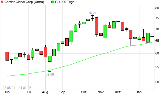 Mit dem Rücksetzer auf 64,84 EUR hat die Carrier Global-Aktie am 21.05.2025 die 200-Tage-Linie nach unten gekreuzt.