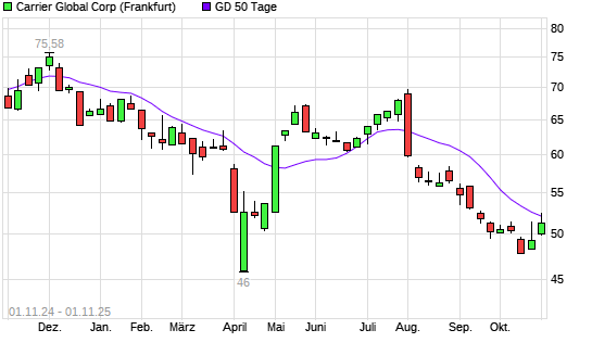 Mit dem Rücksetzer auf 51,24 EUR hat die Carrier Global-Aktie am 31.10.2025 die 50-Tage-Linie nach unten gekreuzt.