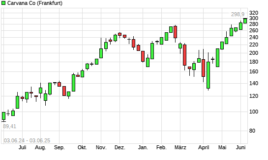 Mit dem Anstieg auf 288,35 EUR hat die Carvana Co.-Aktie (ISIN US1468691027) am 02.06.2025 ein neues 3-Jahres-Hoch erreicht und damit den Kurs vom 30.05.2025 eingestellt.