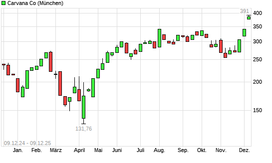 Mit dem Anstieg auf 385,55 EUR hat die Carvana Co.-Aktie (ISIN US1468691027) am 08.12.2025 ein neues All-Time-High erreicht und damit den Kurs vom 05.12.2025 eingestellt.