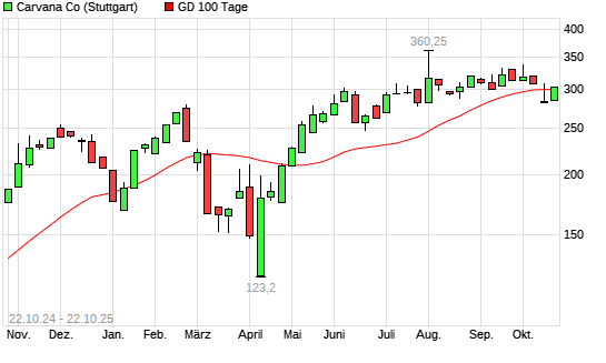 Mit dem Anstieg auf 307,50 EUR hat die Carvana Co.-Aktie am 21.10.2025 die 100-Tage-Linie nach oben gekreuzt.