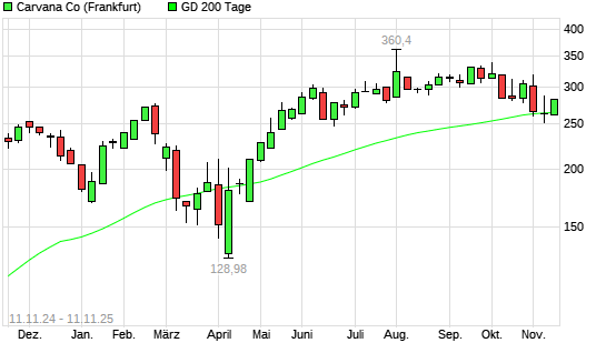 Mit dem Anstieg auf 279,25 EUR hat die Carvana Co.-Aktie am 10.11.2025 die 200-Tage-Linie nach oben gekreuzt.