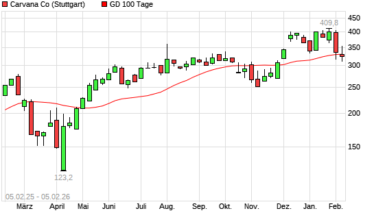 Mit dem Rücksetzer auf 332,75 EUR hat die Carvana Co.-Aktie am 04.02.2026 die 100-Tage-Linie nach unten gekreuzt.