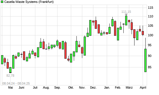 Mit dem Rücksetzer auf 83,00 EUR hat die Casella Waste Systems-Aktie (ISIN US1474481041) am 07.04.2025 ein neues 12-Monats-Tief erreicht und damit den Kurs vom 02.05.2024 eingestellt.