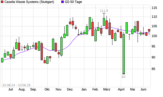 Mit dem Rücksetzer auf 101,05 EUR hat die Casella Waste Systems-Aktie am 09.06.2025 die 50-Tage-Linie nach unten gekreuzt.