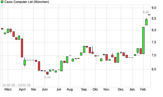 Mit dem Anstieg auf 8,66 EUR hat die Casio Computer-Aktie (ISIN JP3209000003) am 09.02.2026 ein neues 12-Monats-Hoch erreicht und damit den Kurs vom 03.02.2026 eingestellt.