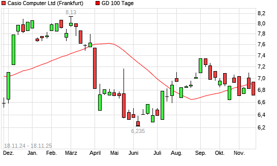 Mit dem Anstieg auf 6,94 EUR hat die Casio Computer-Aktie am 17.11.2025 die 100-Tage-Linie nach oben gekreuzt.