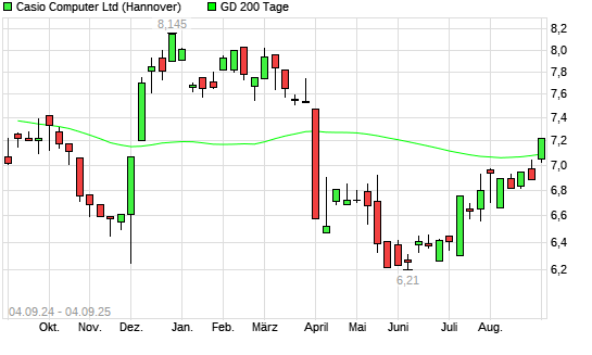 Mit dem Anstieg auf 7,19 EUR hat die Casio Computer-Aktie am 03.09.2025 die 200-Tage-Linie nach oben gekreuzt.