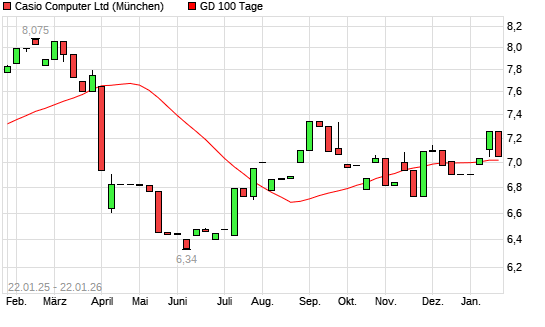 Mit dem Rücksetzer auf 6,94 EUR hat die Casio Computer-Aktie am 21.01.2026 die 100-Tage-Linie nach unten gekreuzt.