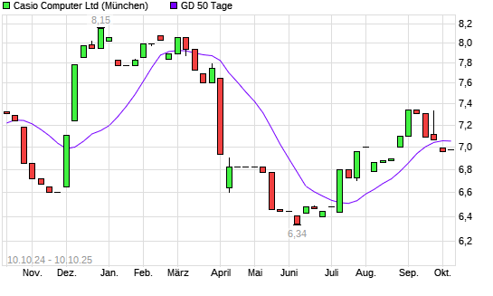 Mit dem Rücksetzer auf 6,90 EUR hat die Casio Computer-Aktie am 09.10.2025 die 50-Tage-Linie nach unten gekreuzt.