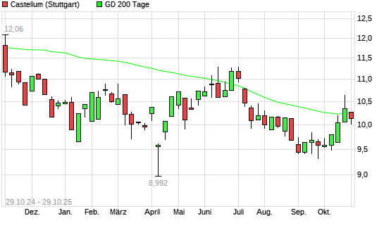 Mit dem Rücksetzer auf 10,18 EUR hat die Castellum-Aktie am 28.10.2025 die 200-Tage-Linie nach unten gekreuzt.