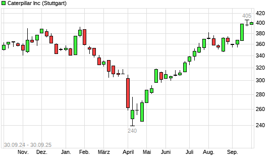 Mit dem Anstieg auf 402,00 EUR hat die Caterpillar-Aktie (ISIN US1491231015) am 29.09.2025 ein neues All-Time-High erreicht und damit den Kurs vom 23.09.2025 eingestellt.