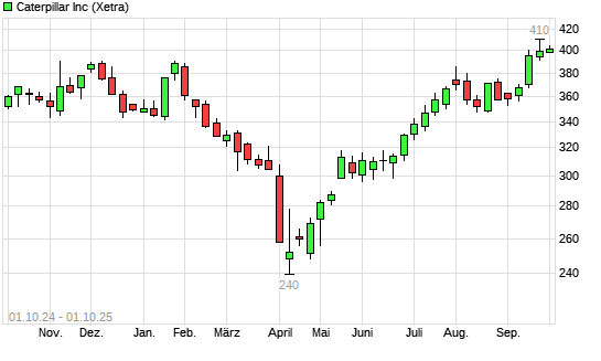 Mit dem Anstieg auf 403,50 EUR hat die Caterpillar-Aktie (ISIN US1491231015) am 30.09.2025 ein neues All-Time-High erreicht und damit den Kurs vom 29.09.2025 eingestellt.