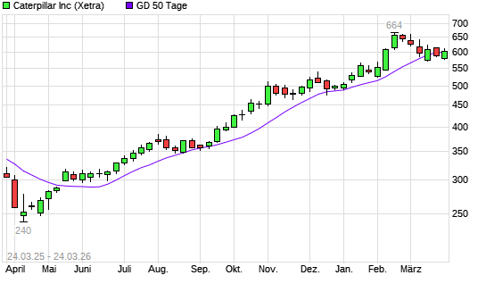 Mit dem Anstieg auf 603,00 EUR hat die Caterpillar-Aktie am 23.03.2026 die 50-Tage-Linie nach oben gekreuzt.