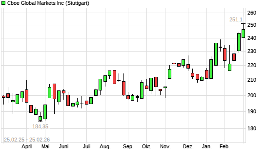 Mit dem Anstieg auf 244,50 EUR hat die Cboe Global Markets-Aktie (ISIN US12503M1080) am 24.02.2026 ein neues All-Time-High erreicht und damit den Kurs vom 19.02.2026 eingestellt.