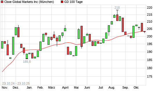 Die Cboe Global Markets-Aktie befindet sich seit dem 18.09.2025 im langfristigen Aufwärtstrend und hat in diesem Zeitraum +1,33% an Wert gewonnen. Der Abstand zur 200-Tage-Linie beträgt aktuell +0,25%.