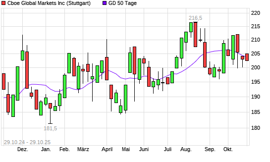 Mit dem Rücksetzer auf 202,70 EUR hat die Cboe Global Markets-Aktie am 28.10.2025 die 50-Tage-Linie nach unten gekreuzt.