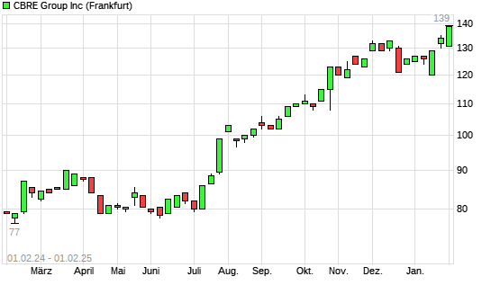 Mit dem Anstieg auf 139,00 EUR hat die Cbre Group-Aktie (ISIN US12504L1098) am 31.01.2025 ein neues All-Time-High erreicht und damit den Kurs vom 30.01.2025 eingestellt.