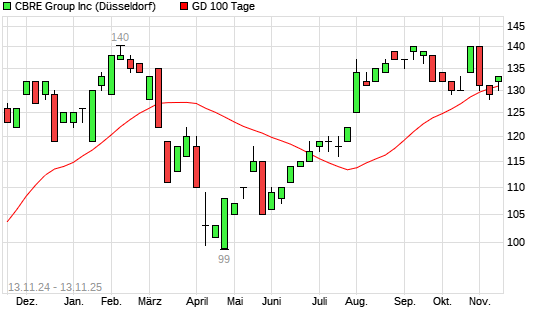 Mit dem Rücksetzer auf 130,00 EUR hat die Cbre Group-Aktie am 14.11.2025 die 100-Tage-Linie nach unten gekreuzt.Die Cbre Group-Aktie befindet sich seit dem 23.07.2025 im langfristigen Aufwärtstrend ...weiterlesen
