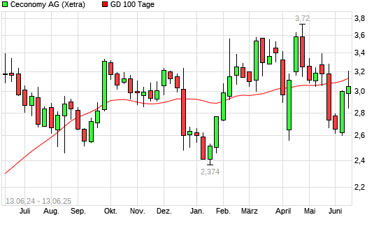 Mit dem Rücksetzer auf 3,12 EUR hat die Ceconomy St-Aktie am 12.06.2025 die 100-Tage-Linie nach unten gekreuzt.