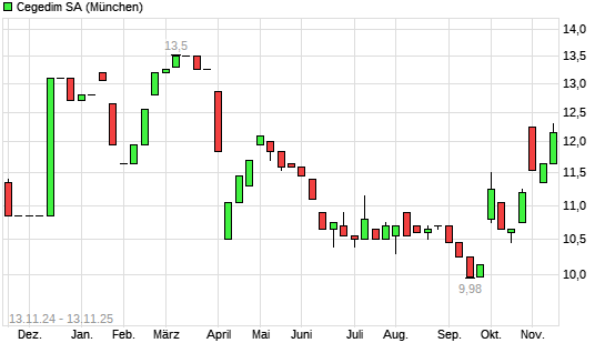 Mit dem Anstieg auf 12,10 EUR hat die Cegedim-Aktie (ISIN FR0000053506) am 12.11.2025 ein neues 6-Monats-Hoch erreicht und damit den Kurs vom 12.05.2025 eingestellt.